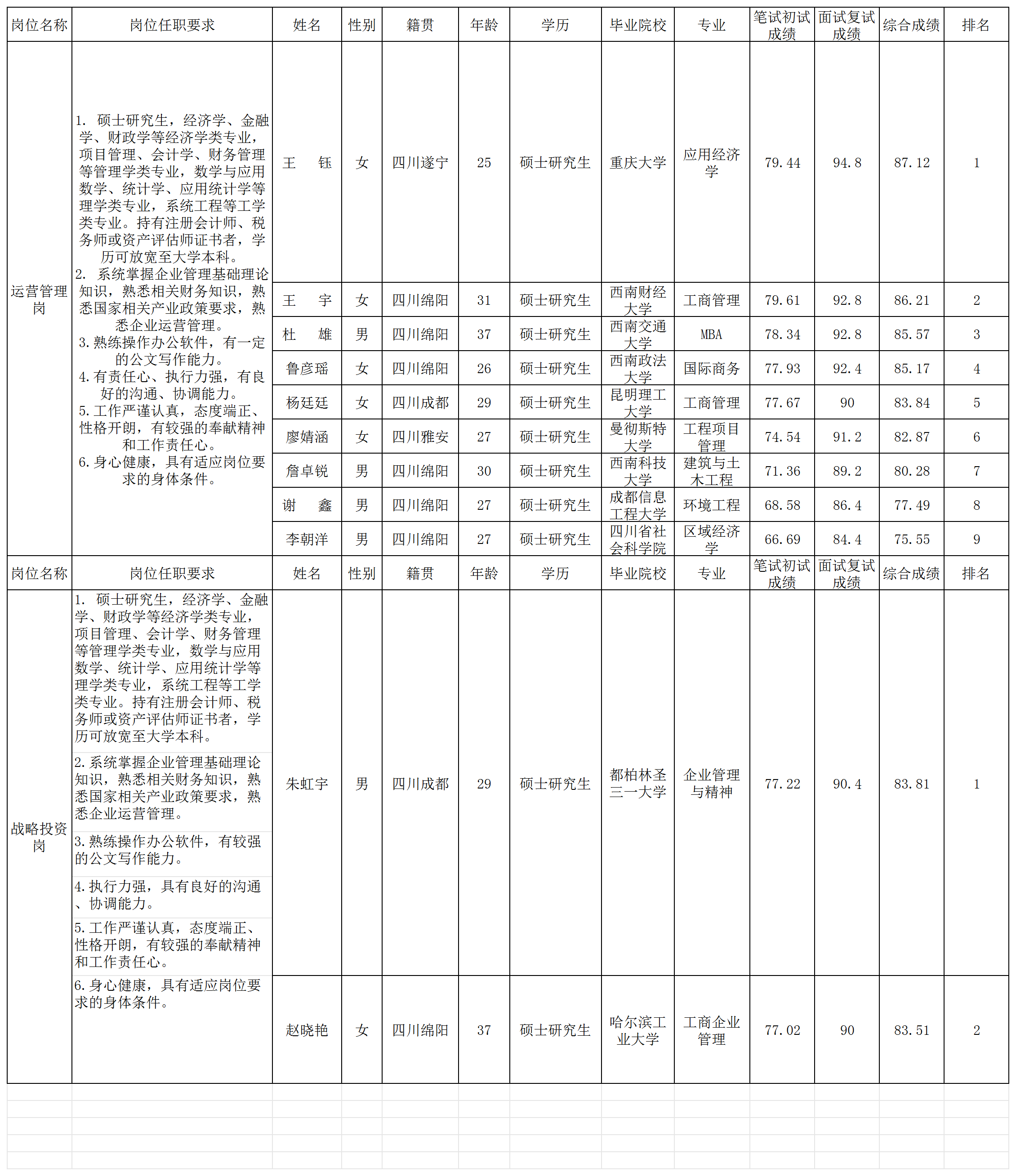 根據(jù)綿陽市投資控股(集團)有限公司發(fā)布的招聘資本運營中心運營管理崗、戰(zhàn)略投資崗的公告及招聘相關(guān)規(guī)定,經(jīng)筆試初試、面試復試相關(guān)程序,現(xiàn)將初試綜合成績予以公示。