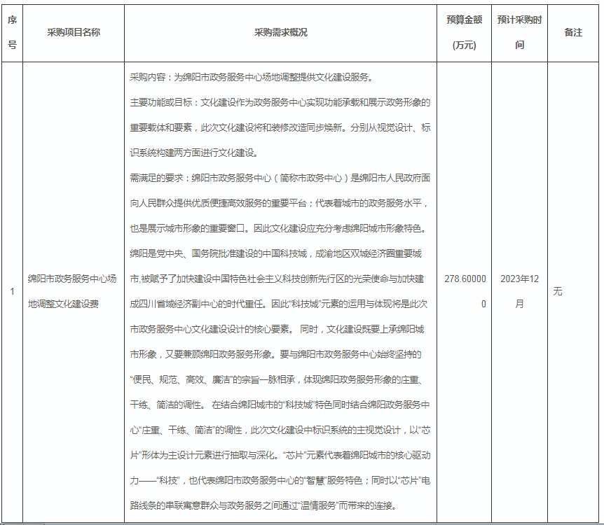 為便于供應(yīng)商及時(shí)了解政府采購信息,根據(jù)《四川省財(cái)政廳關(guān)于開展政府采購意向公開工作的通知》(川財(cái)采〔2021〕153號(hào))要求,現(xiàn)將綿陽市政務(wù)服務(wù)監(jiān)督管理局2023年度(第8批)采購意向公開如下: