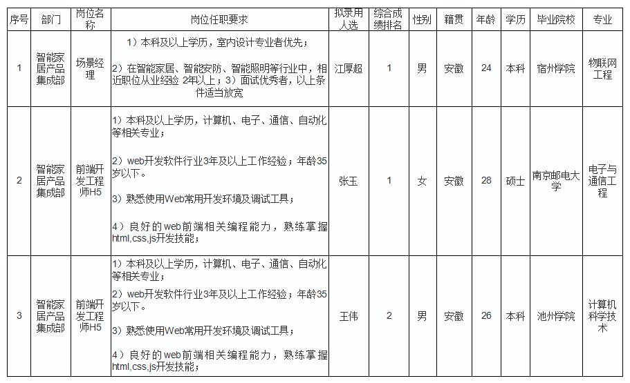 根據(jù)四川虹美智能科技有限公司發(fā)布的招聘公告及招聘相關(guān)規(guī)定,經(jīng)筆試、面試、考察、體檢等程序,擬錄用江厚超、王偉、張玉同志到四川虹美智能科技有限公司工作,現(xiàn)予以公示,具體情況如下: