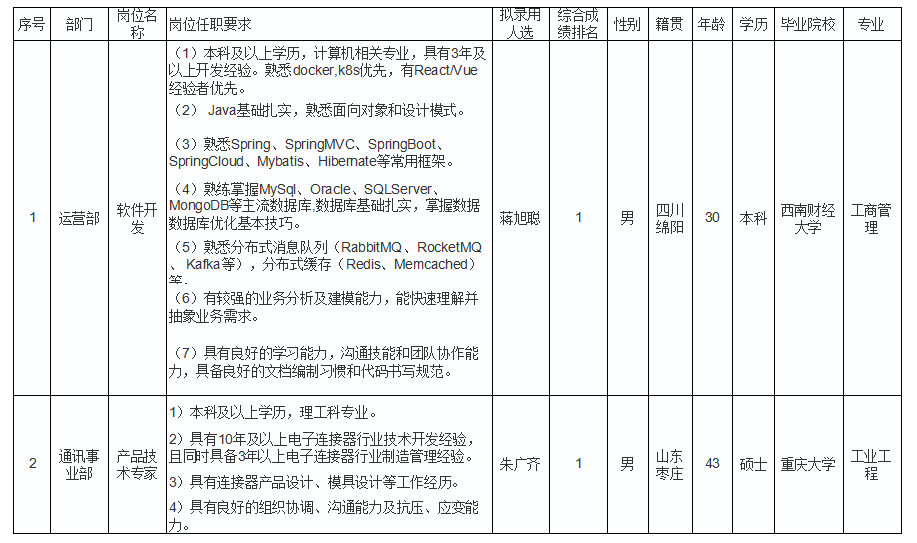 根據(jù)四川華豐科技股份公司發(fā)布的招聘公告及招聘相關(guān)規(guī)定,經(jīng)筆試、面試、考察、體檢等程序,擬錄用蔣旭聰?shù)韧镜剿拇ㄈA豐科技股份有限公司工作,現(xiàn)予以公示,具體情況如下: