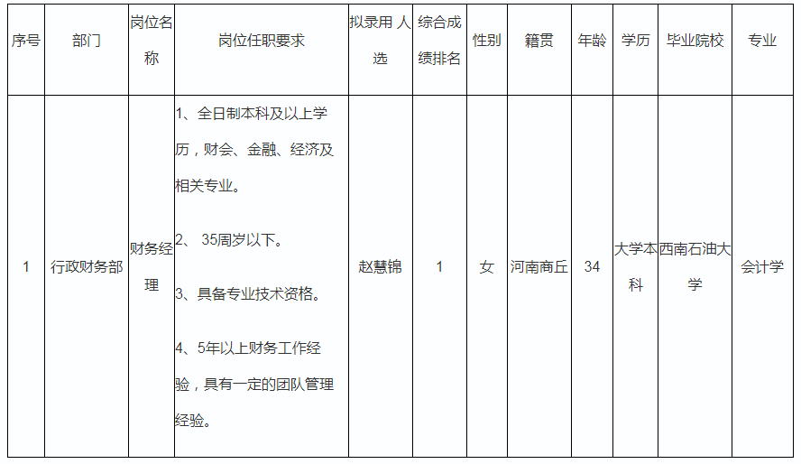 根據(jù)成都長虹融資租賃有限責任公司發(fā)布的招聘公告及招聘相關規(guī)定,經(jīng)面試、考察、體檢等程序,擬錄用趙慧錦同志到成都長虹融資租賃有限責任公司工作,現(xiàn)予以公示,具體情況如下: