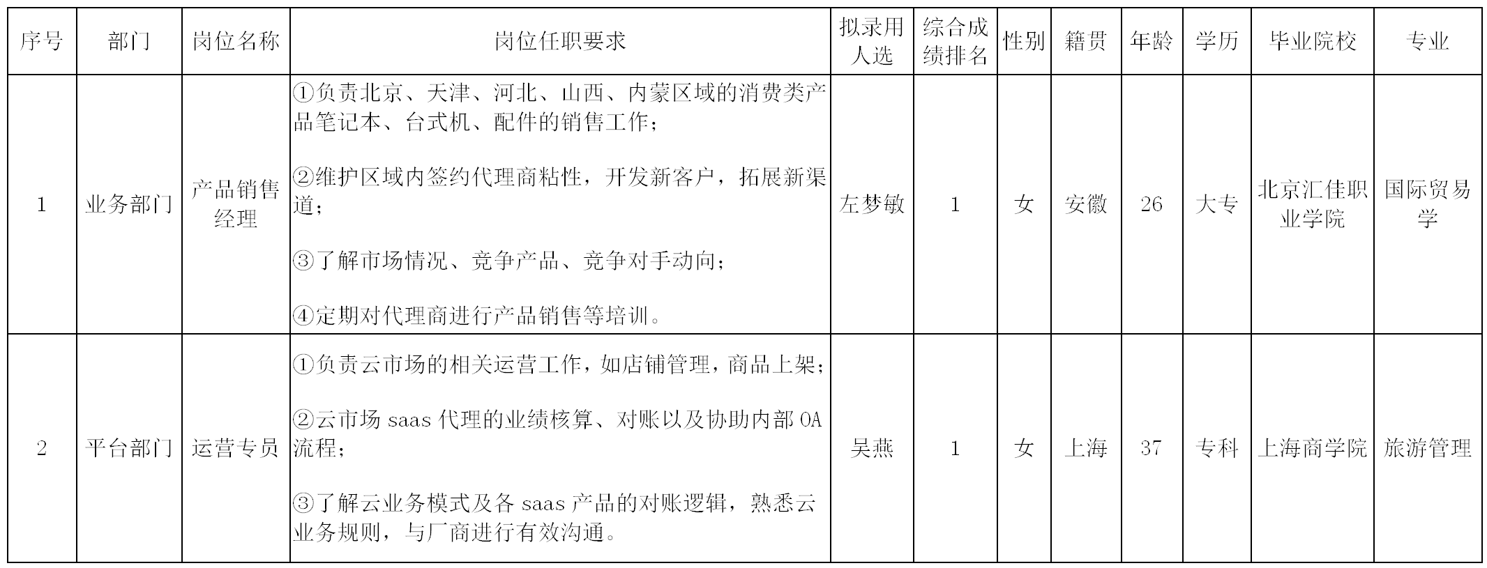 根據(jù)四川長(zhǎng)虹佳華信息產(chǎn)品有限責(zé)任公司發(fā)布的招聘公告及招聘相關(guān)規(guī)定,經(jīng)筆試、面試、考察、體檢等程序,擬錄用左夢(mèng)敏、吳燕同志到四川長(zhǎng)虹佳華信息產(chǎn)品有限責(zé)任公司工作,現(xiàn)予以公示,具體情況如下: