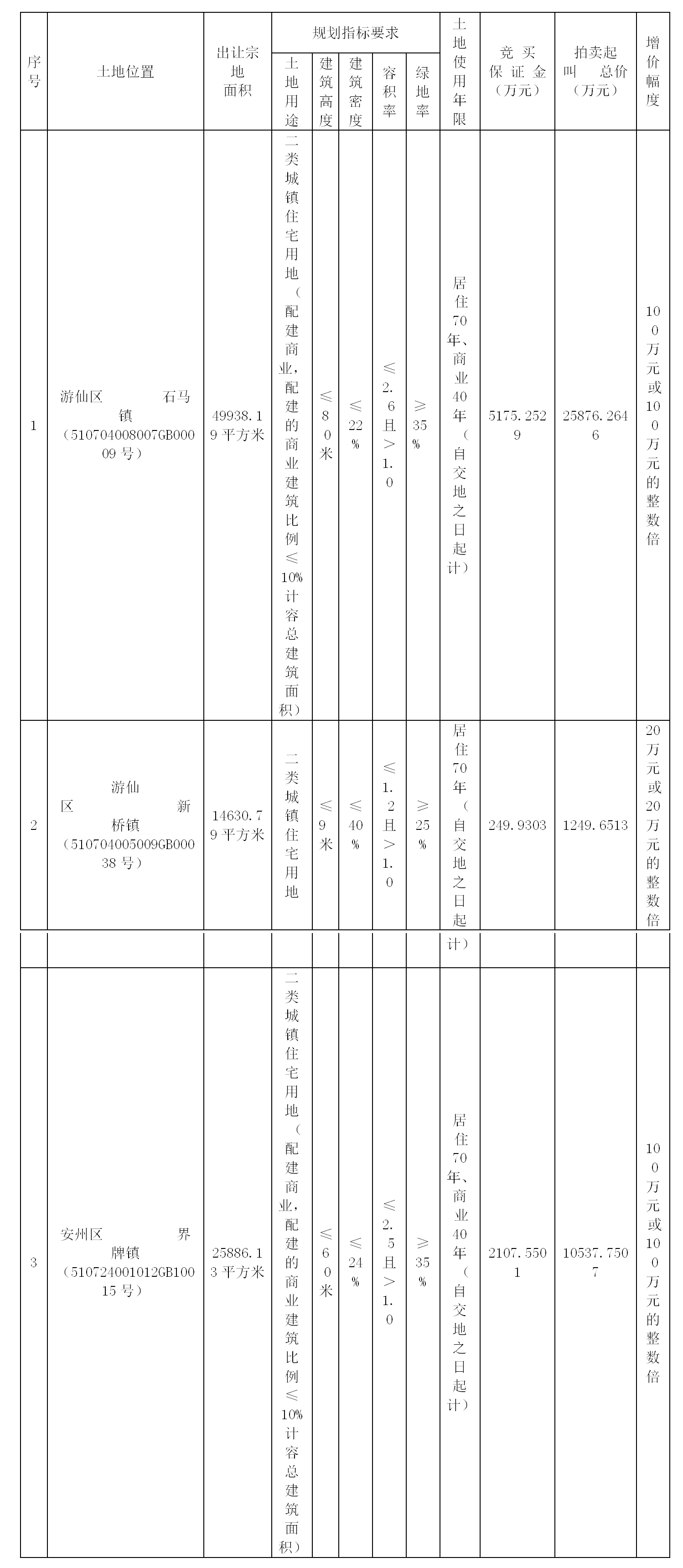 上述3宗地均以現(xiàn)狀出讓,1號宗地土地利用要求詳見《地塊規(guī)劃條件》(綿自然資規(guī)設〔2023〕265號),2號宗地土地利用要求詳見《地塊規(guī)劃條件》(綿自然資規(guī)設〔2023〕249號)及《規(guī)劃審查意見》(綿自然資規(guī)審〔2023〕752號),3號宗地土地利用要求詳見《地塊規(guī)劃條件》(綿自然資規(guī)設〔2023〕267號)。