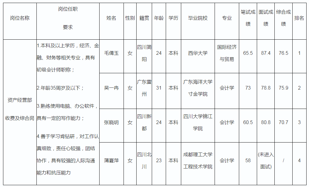 根據(jù)綿陽富達資產經(jīng)營有限責任公司發(fā)布的招聘公告及招聘相關規(guī)定,經(jīng)筆試、面試等程序,現(xiàn)將筆試(面試)成績予以公示。