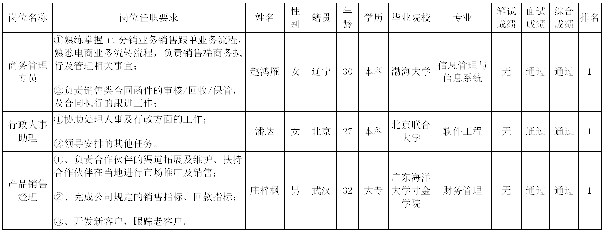 根據(jù)四川長虹佳華信息產(chǎn)品有限責任公司發(fā)布的招聘公告及招聘相關規(guī)定,經(jīng)筆試、面試等程序,現(xiàn)將筆試(面試)成績予以公示。