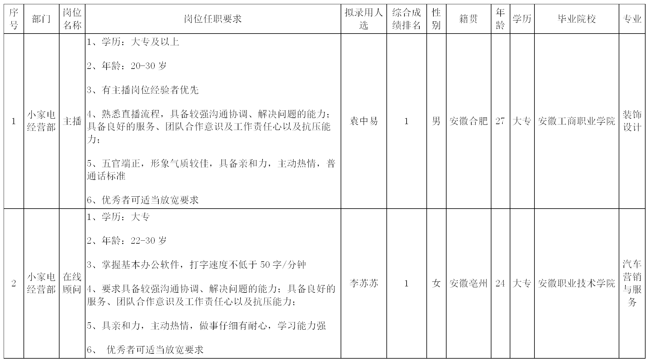 根據(jù)公司經(jīng)營(yíng)管理需要,小家電經(jīng)營(yíng)部招聘主播等崗位2人,經(jīng)簡(jiǎn)歷篩選、面試、體檢等程序,袁中易等人滿足錄用條件,現(xiàn)予以公示。