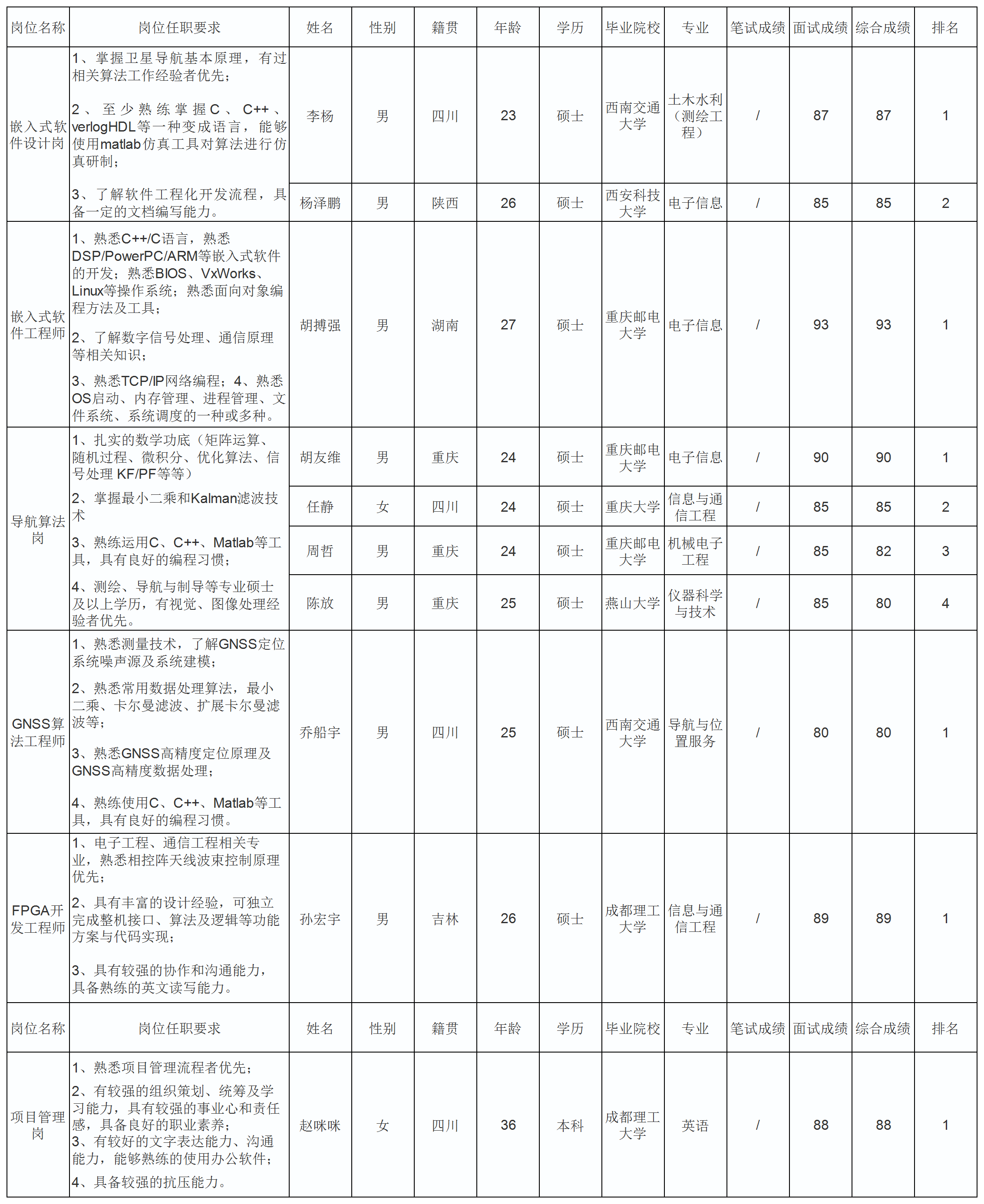 根據(jù)重慶九洲星熠導(dǎo)航設(shè)備有限公司發(fā)布的招聘公告及招聘相關(guān)規(guī)定,經(jīng)面試等程序,現(xiàn)將面試成績予以公示: