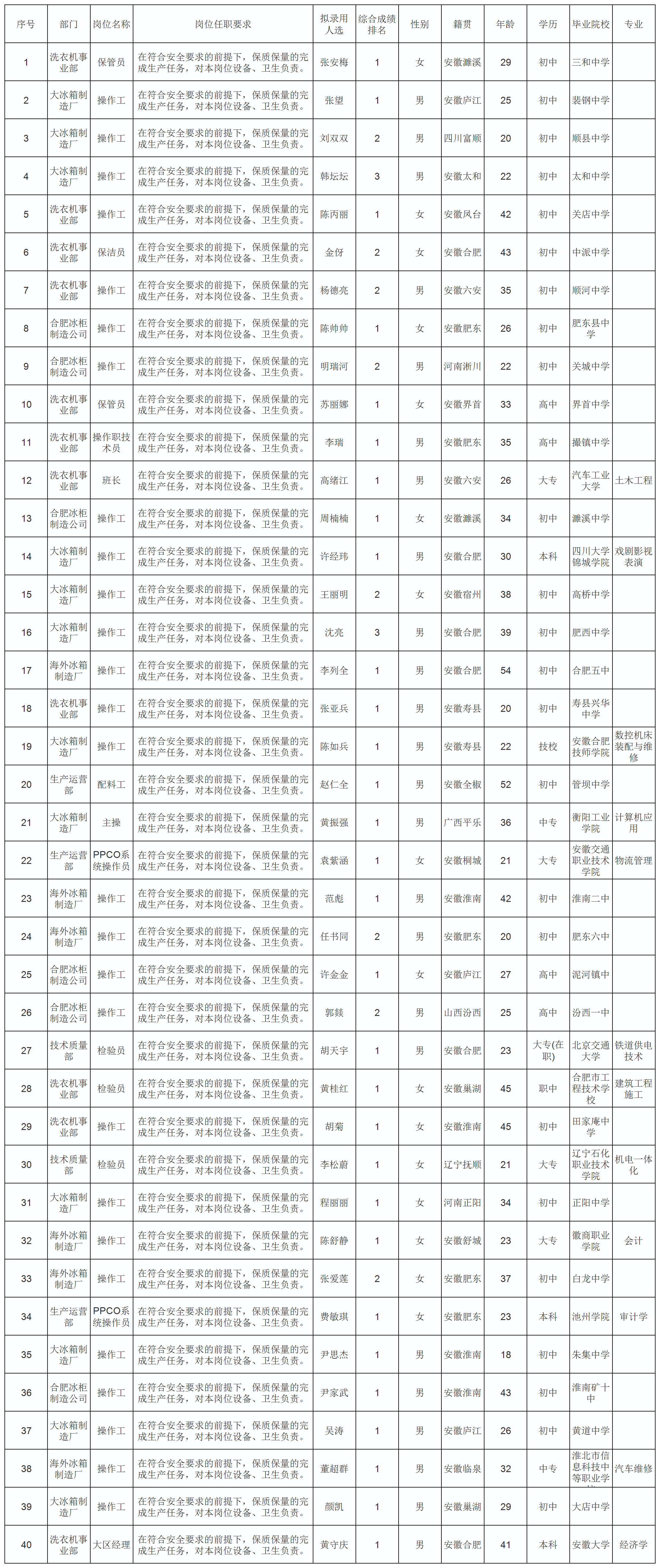 根據(jù)長(zhǎng)虹美菱股份有限公司發(fā)布的招聘公告及招聘相關(guān)規(guī)定,經(jīng)面試、體檢等程序,擬錄用張安梅等同志到洗衣機(jī)事業(yè)部等部門工作,現(xiàn)予以公示,具體情況如下: