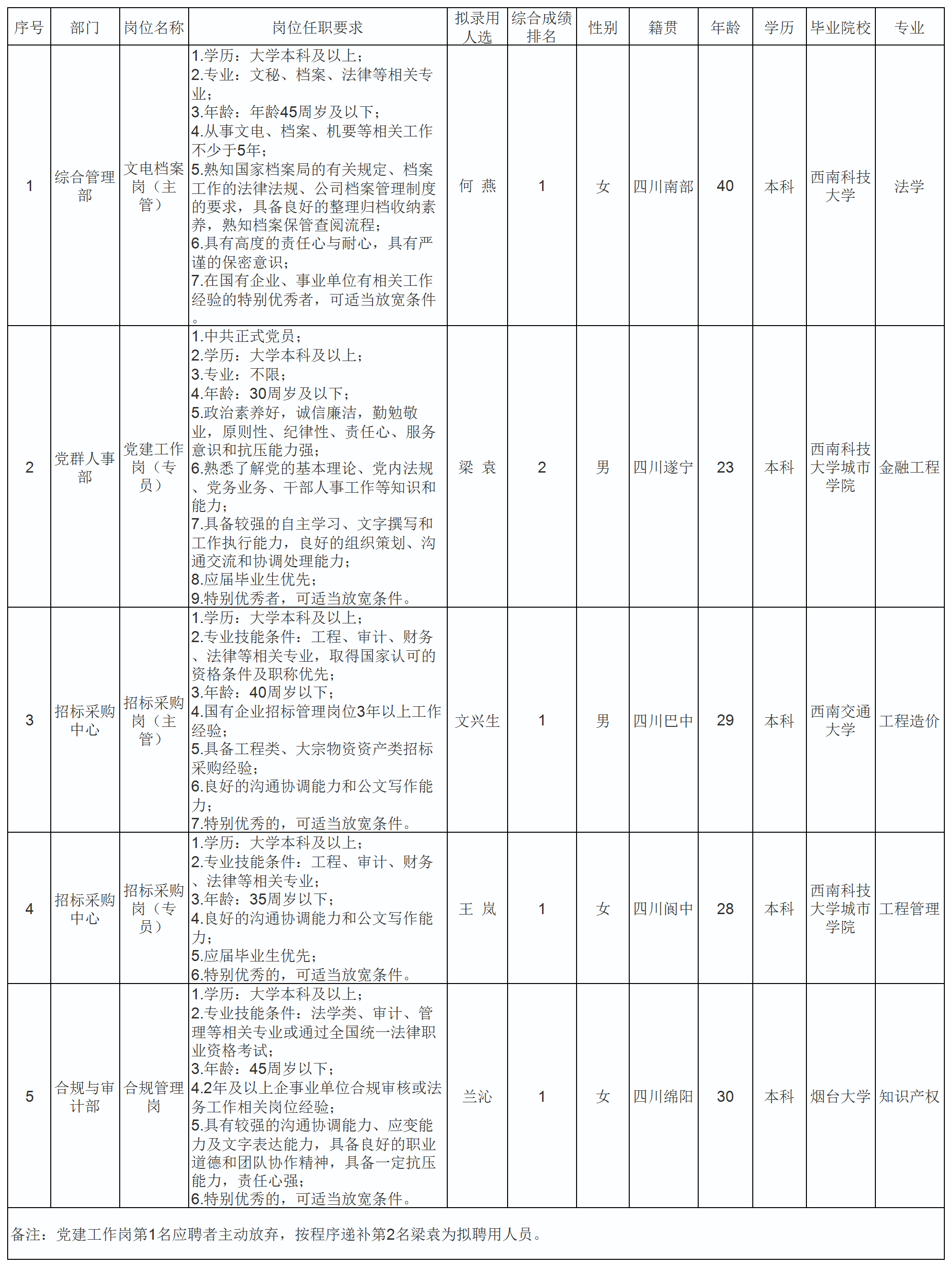 根據(jù)綿陽交通發(fā)展集團有限責(zé)任公司發(fā)布的招聘公告及招聘相關(guān)規(guī)定,經(jīng)筆試、面試、體檢、背景調(diào)查等程序,擬錄用何燕等5名同志到交發(fā)集團工作,現(xiàn)予以公示,具體情況如下: