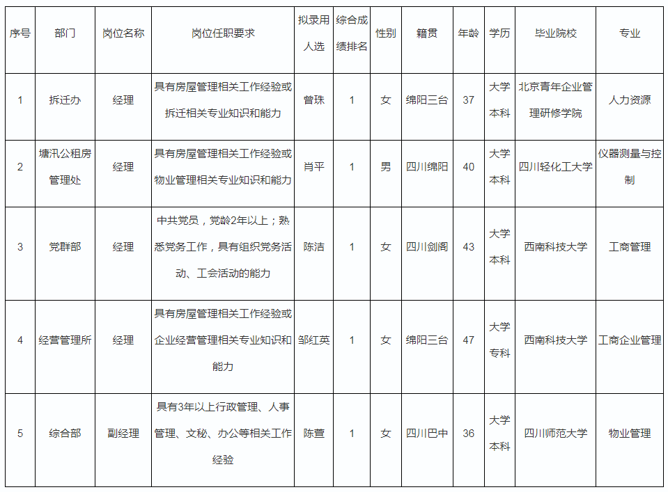 根據(jù)綿陽市康居房產(chǎn)經(jīng)營管理有限公司發(fā)布的康居公司中層管理崗位內部競聘的公告和工作方案相關程序,經(jīng)資格審查、綜合測評、組織考察等程序,擬錄用曾珠為綿陽市康居房產(chǎn)經(jīng)營管理有限公司拆遷辦經(jīng)理、肖平為綿陽市康居房產(chǎn)經(jīng)營管理有限公司塘汛公租房管理處經(jīng)理、陳潔為綿陽市康居房產(chǎn)經(jīng)營管理有限公司黨群部經(jīng)理、鄒紅英為綿陽市康居房產(chǎn)經(jīng)營管理有限公司經(jīng)營管理所經(jīng)理、陳萱同志為綿陽市康居房產(chǎn)經(jīng)營管理有限公司綜合部副經(jīng)理,現(xiàn)予以公示,具體情況如下: