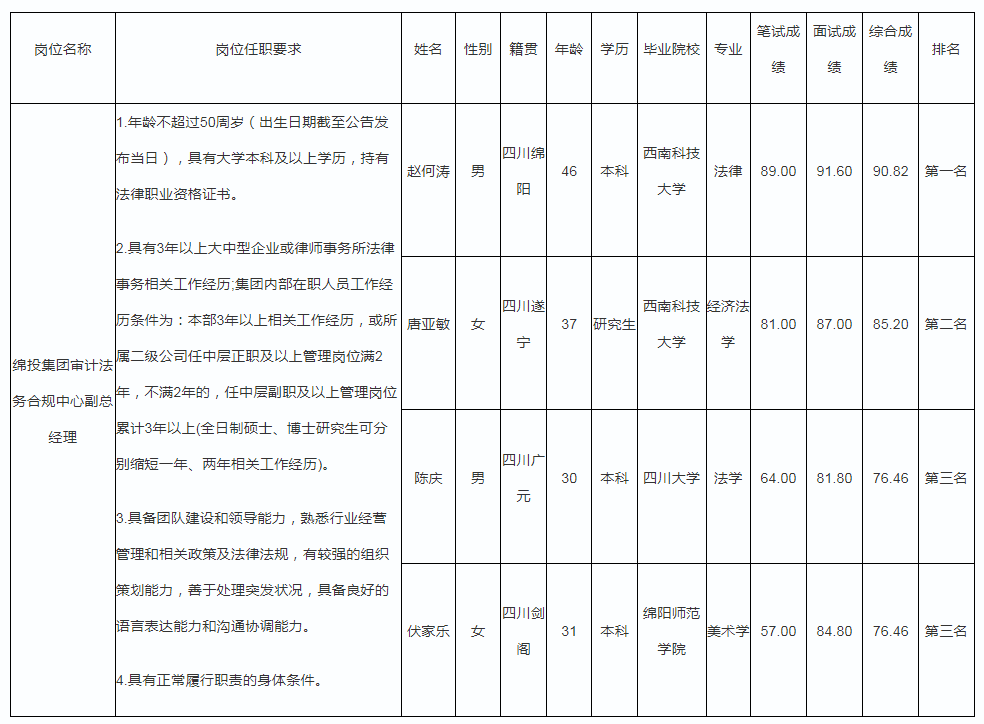 根據(jù)綿陽市投資控股(集團)有限公司關(guān)于審計法務(wù)合規(guī)中心副職市場化選聘的公告及招聘相關(guān)規(guī)定,經(jīng)筆試、面試等程序,現(xiàn)將競聘成績予以公示。