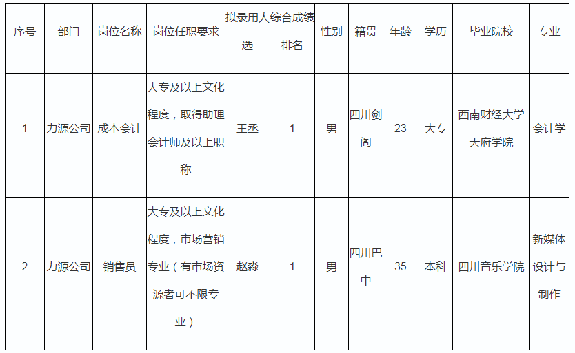 根據(jù)零八一電子集團四川力源電子有限公司發(fā)布的招聘公告及招聘相關規(guī)定,經(jīng)筆試、面試、考察、體檢等程序,擬錄用王丞、趙淼同志到力源公司工作,現(xiàn)予以公示,具體情況如下: