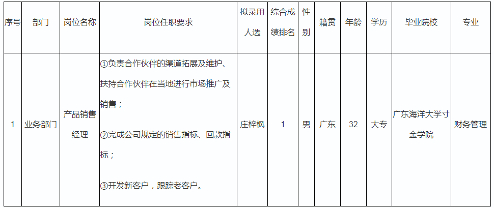 根據(jù)四川長(zhǎng)虹佳華信息產(chǎn)品有限責(zé)任公司發(fā)布的招聘公告及招聘相關(guān)規(guī)定,經(jīng)筆試、面試、考察、體檢等程序,擬錄用莊梓楓同志到四川長(zhǎng)虹佳華信息產(chǎn)品有限責(zé)任公司工作,現(xiàn)予以公示,具體情況如下: