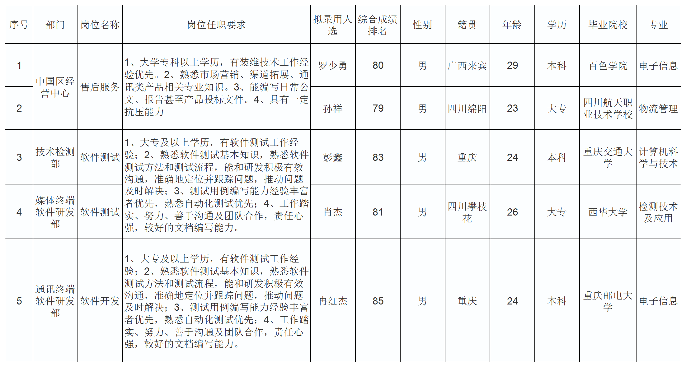 根據(jù)四川長虹網(wǎng)絡(luò)科技有限責任公司發(fā)布的招聘公告及招聘相關(guān)規(guī)定,經(jīng)筆試、面試、考察、體檢等程序,擬錄用羅少勇等同志到中國區(qū)經(jīng)營中心等部門,現(xiàn)予以公示,具體情況如下: