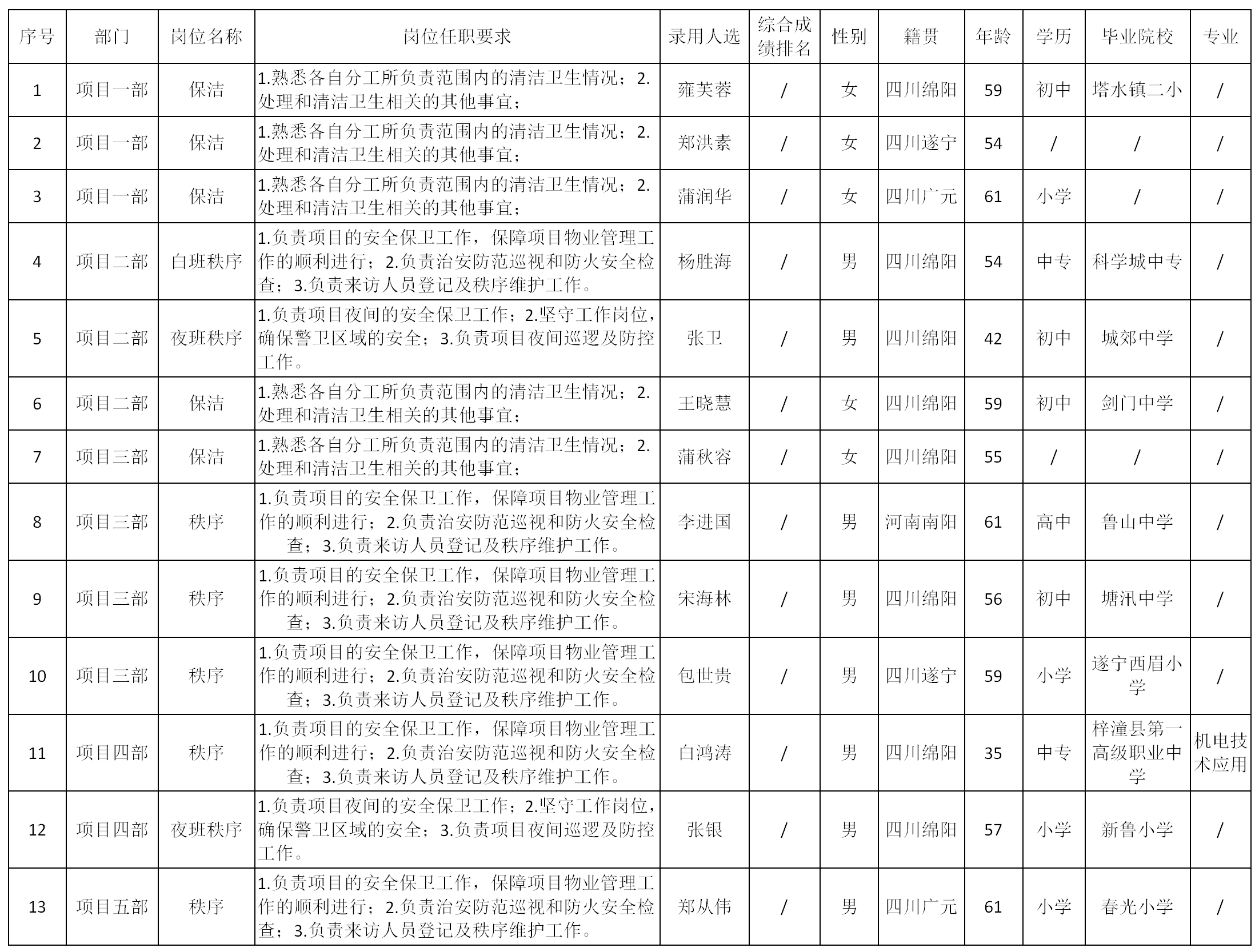 根據(jù)綿陽市康來物業(yè)服務(wù)有限公司發(fā)布的招聘公告及招聘相關(guān)規(guī)定,經(jīng)面試、試用等程序,擬錄用以下人員到綿陽市康來物業(yè)服務(wù)有限公司各項(xiàng)目部工作,現(xiàn)予以公示,具體情況如下: