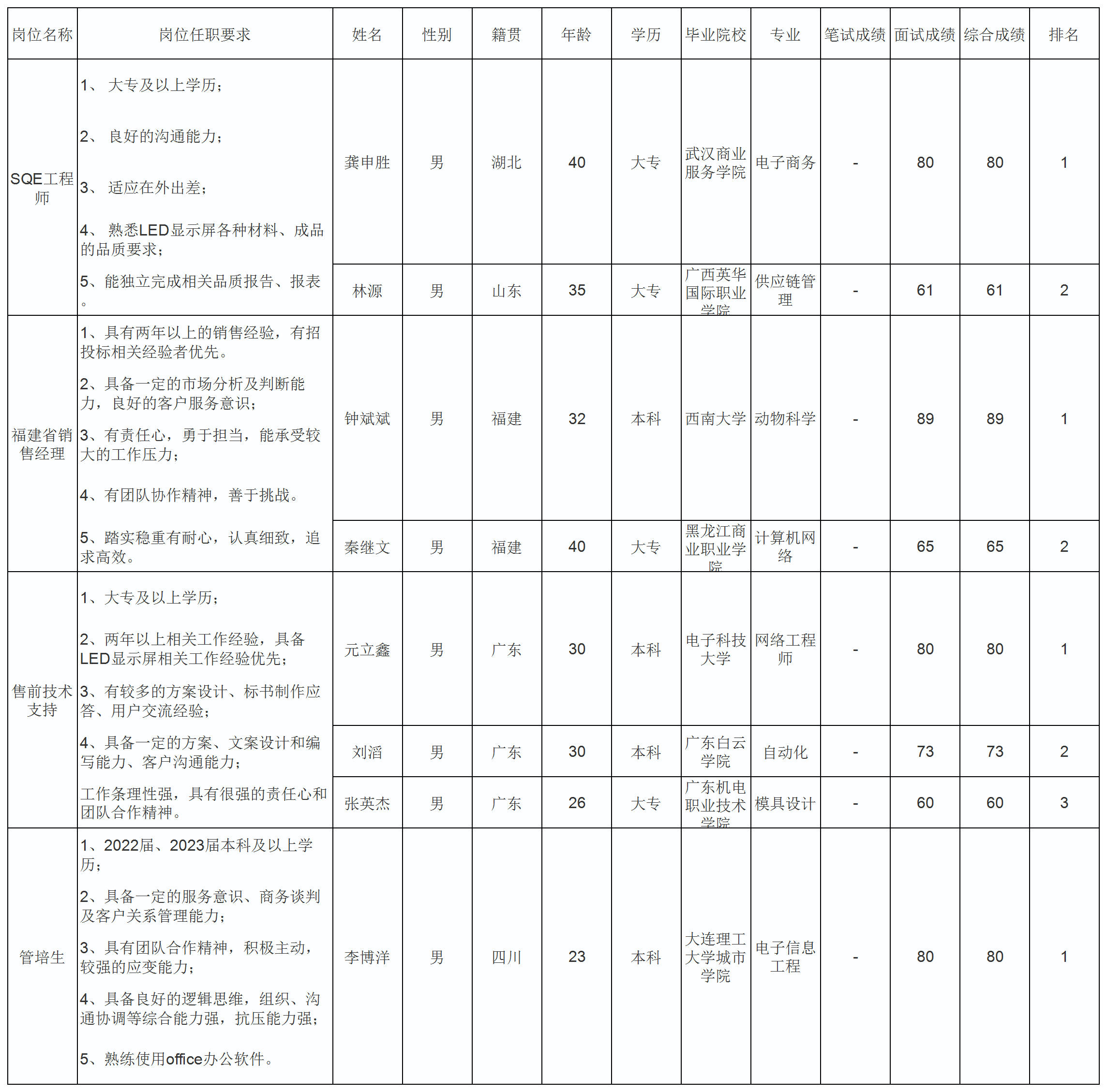 根據(jù)深圳市九洲光電科技有限公司發(fā)布的招聘公告及招聘相關(guān)規(guī)定,經(jīng)筆試、面試等程序,現(xiàn)將筆試(面試)成績予以公示。