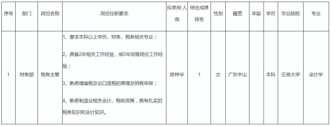 根據(jù)中山長虹電器有限公司發(fā)布的招聘公告及招聘相關規(guī)定,經(jīng)筆試、面試、考察、體檢等程序,擬錄用陳梓華同志到稅務主管崗位工作,現(xiàn)予以公示,具體情況如下: