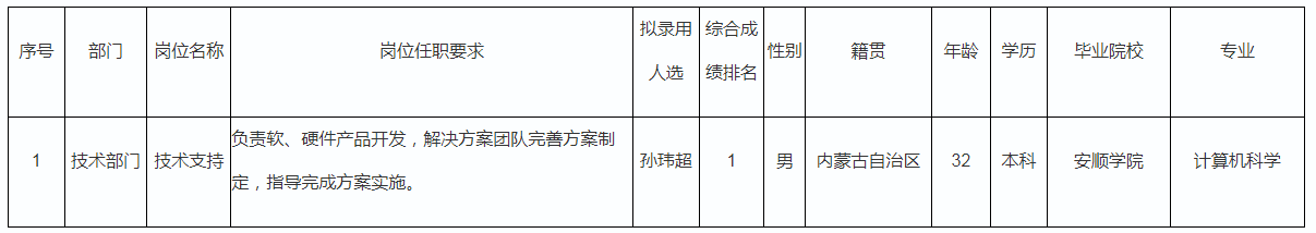 根據(jù)四川長虹佳華信息產(chǎn)品有限責(zé)任公司發(fā)布的招聘公告及招聘相關(guān)規(guī)定,經(jīng)筆試、面試、考察、體檢等程序,擬錄用孫瑋超同志到四川長虹佳華信息產(chǎn)品有限責(zé)任公司工作,現(xiàn)予以公示,具體情況如下: