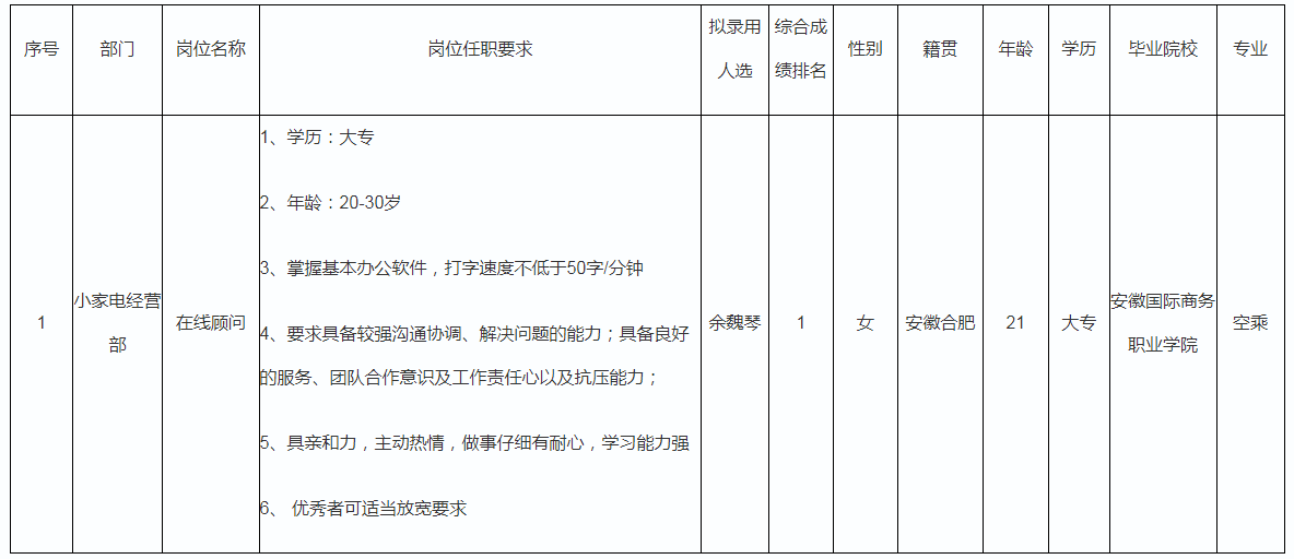 根據(jù)公司經(jīng)營管理需要,小家電經(jīng)營部招聘在線顧問崗位1人,經(jīng)簡歷篩選、面試、體檢等程序,余魏琴滿足錄用條件,現(xiàn)予以公示。