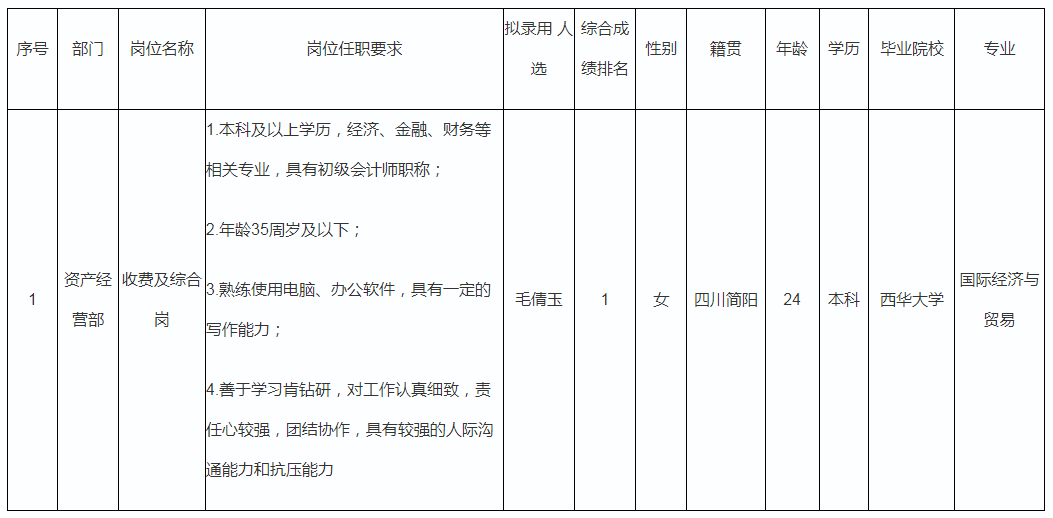 根據(jù)綿陽富達(dá)資產(chǎn)經(jīng)營有限責(zé)任公司發(fā)布的招聘公告及招聘相關(guān)規(guī)定,經(jīng)筆試、面試、考察、體檢等程序,擬錄用毛倩玉同志到資產(chǎn)經(jīng)營部收費(fèi)及綜合崗工作,現(xiàn)予以公示,具體情況如下: