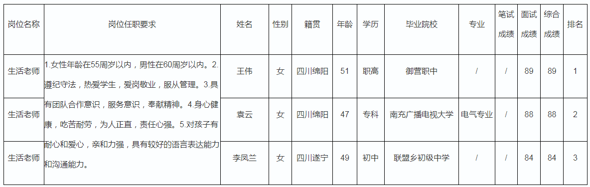 根據(jù)綿陽中學(xué)實(shí)驗(yàn)學(xué)校發(fā)布的招聘公告及招聘相關(guān)規(guī)定,經(jīng)面試等程序,現(xiàn)將成績(jī)予以公示。