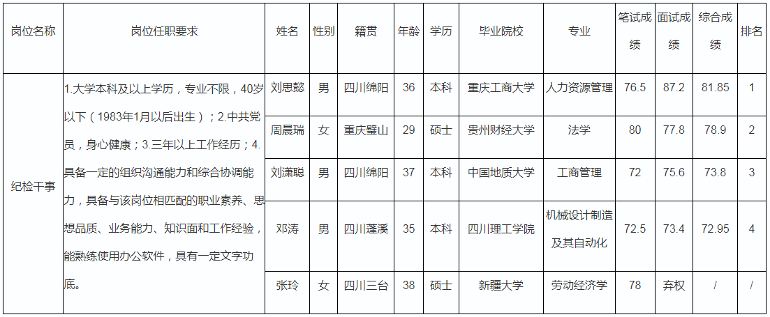 根據(jù)綿陽(yáng)人才集團(tuán)發(fā)布的招聘公告及招聘相關(guān)規(guī)定,經(jīng)筆試、面試等程序,現(xiàn)將筆試(面試)成績(jī)予以公示。