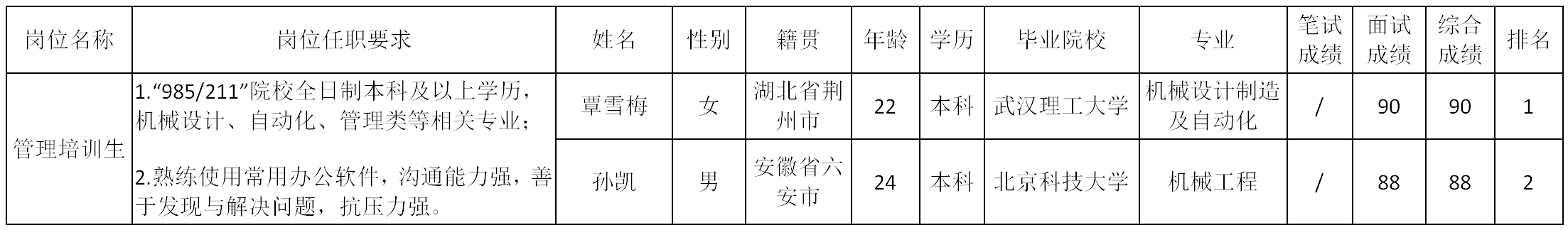 根據(jù)四川波鴻實業(yè)有限公司發(fā)布的招聘公告及招聘相關(guān)規(guī)定,經(jīng)筆試、面試等程序,現(xiàn)將威斯卡特工業(yè)(中國)有限公司管理培訓生崗位面試成績予以公示。