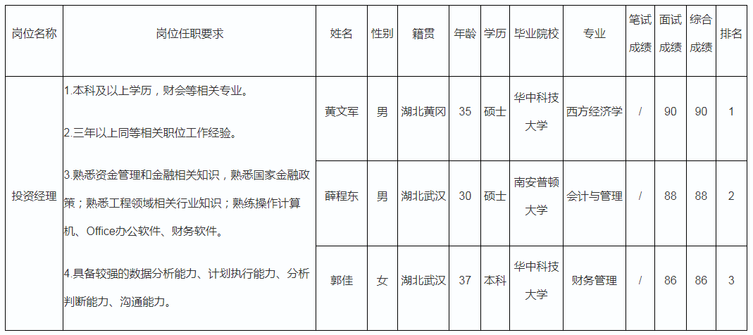 根據(jù)四川波鴻實業(yè)有限公司發(fā)布的招聘公告及招聘相關(guān)規(guī)定,經(jīng)面試后,將四川波鴻實業(yè)有限公司投資經(jīng)理崗位面試成績予以公示。