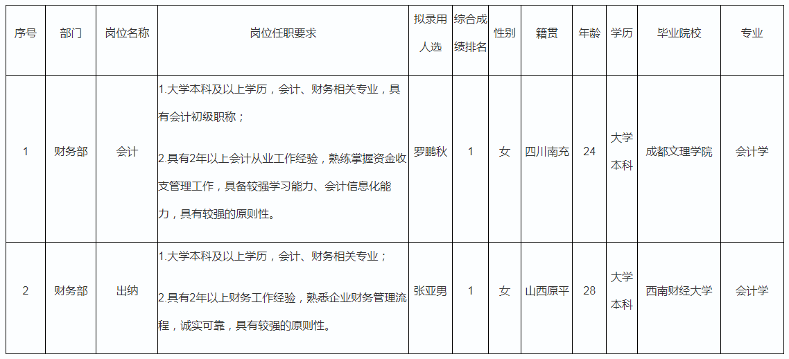 根據(jù)大道供應(yīng)鏈公司發(fā)布的招聘公告及招聘相關(guān)規(guī)定,經(jīng)初試、復(fù)試、體檢等程序,擬錄用羅鵬秋、張亞男2名同志,現(xiàn)予以公示,具體情況如下:
