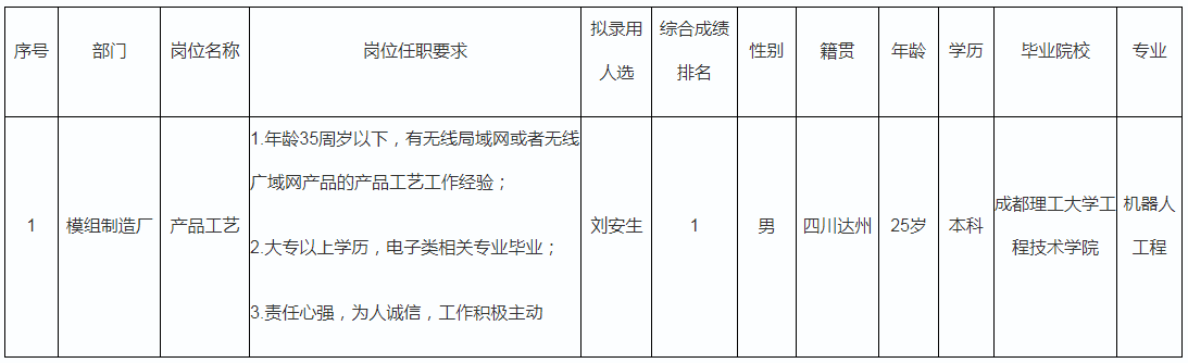 根據(jù)四川愛(ài)聯(lián)科技股份有限公司發(fā)布的招聘公告及招聘相關(guān)規(guī)定,經(jīng)筆試、面試、考察、體檢等程序,擬錄用劉安生同志到模組產(chǎn)品工藝工作,現(xiàn)予以公示,具體情況如下: