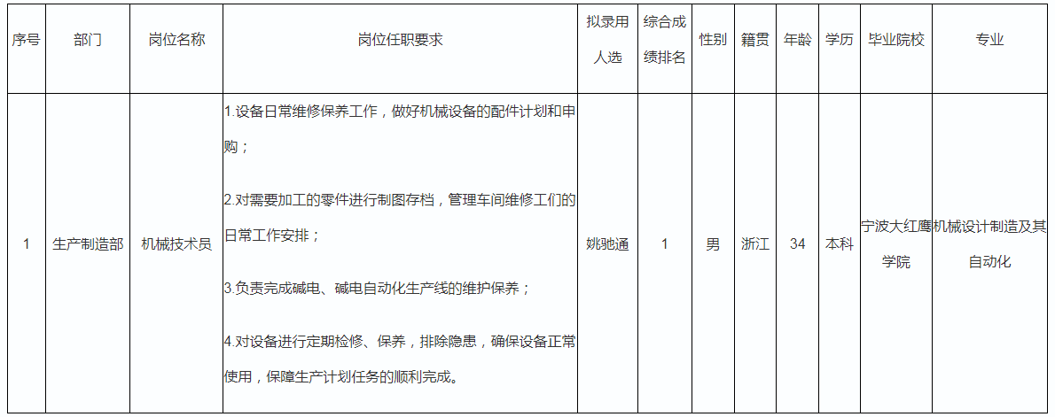 根據(jù)浙江長(zhǎng)虹飛獅電器工業(yè)有限公司發(fā)布的招聘公告及招聘相關(guān)規(guī)定,經(jīng)筆試、面試、考察、體檢等程序,擬錄用姚馳通同志到浙江長(zhǎng)虹飛獅電器工業(yè)有限公司工作,現(xiàn)予以公示,具體情況如下: