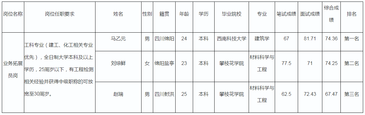 根據(jù)綿陽市建設(shè)工程質(zhì)量檢測(cè)中心有限責(zé)任公司發(fā)布的招聘公告及招聘相關(guān)規(guī)定,經(jīng)筆試、面試等程序,現(xiàn)將筆試(面試)成績(jī)予以公示。