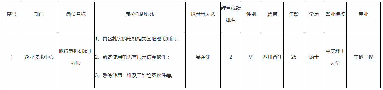 根據(jù)成都微精電機(jī)股份公司發(fā)布的招聘公告及招聘相關(guān)規(guī)定,經(jīng)筆試、面試、考察、體檢等程序,擬錄用晏蓬淵同志到成都微精電機(jī)股份公司工作,現(xiàn)予以公示,具體情況如下: