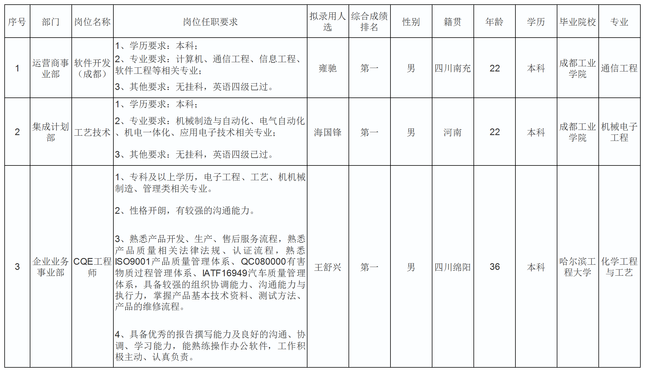 根據(jù)四川九州電子科技股份有限公司發(fā)布的招聘公告及招聘相關規(guī)定,經(jīng)筆試、面試、考察、體檢等程序,擬錄用雍馳等3名同志到四川九州電子科技股份有限公司工作,現(xiàn)予以公示,具體情況如下: