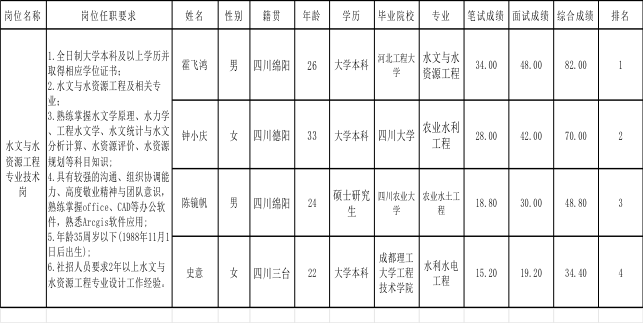根據(jù)綿陽(yáng)市水利規(guī)劃設(shè)計(jì)研究院有限公司發(fā)布的招聘公告及招聘相關(guān)規(guī)定,經(jīng)筆試、面試等程序,現(xiàn)將筆試、面試成績(jī)予以公示。