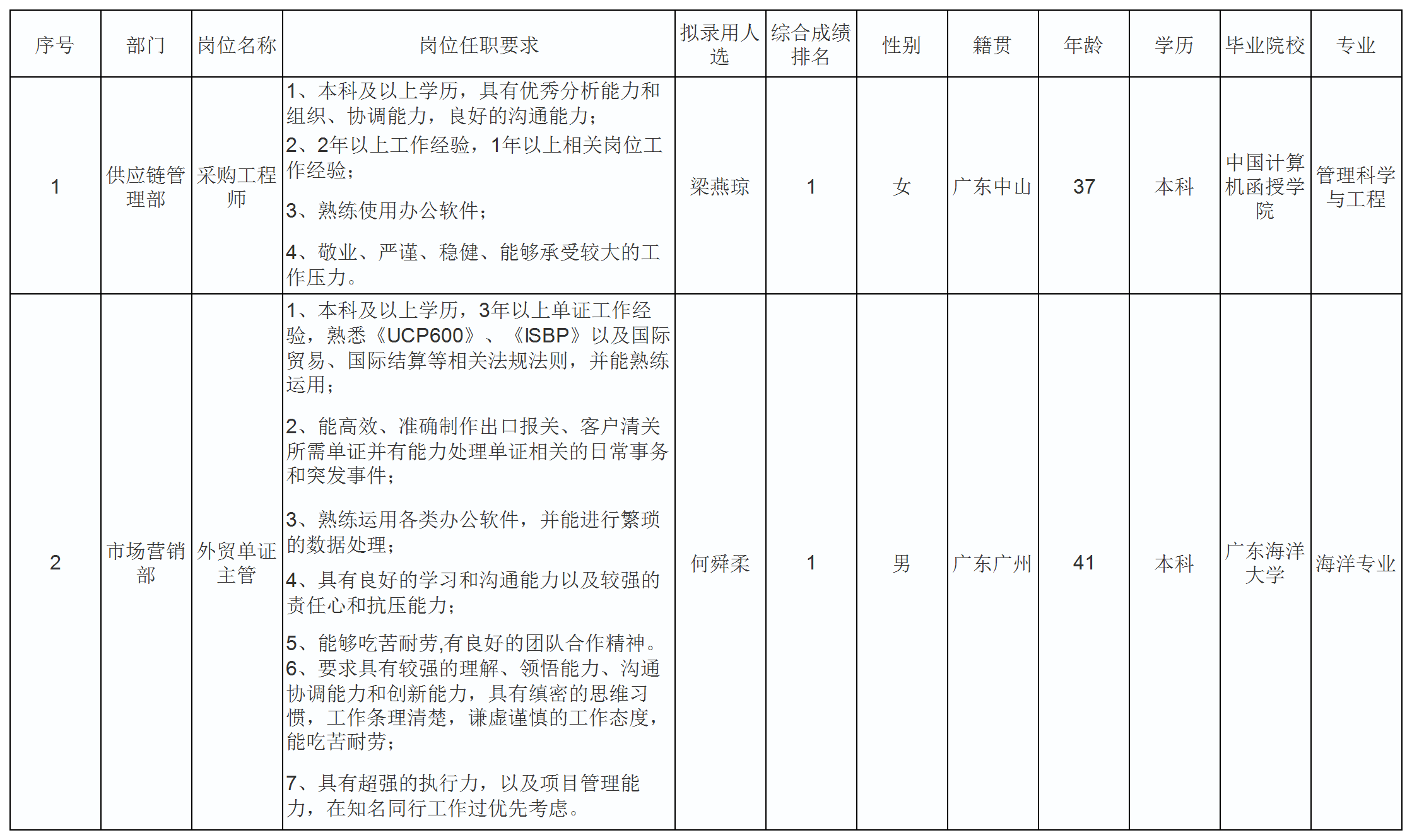 根據(jù)廣東長(zhǎng)虹電子有限公司發(fā)布的招聘公告及招聘相關(guān)規(guī)定,經(jīng)面試、考察、體檢等程序,擬錄用梁燕瓊同志到供應(yīng)鏈管理部、何舜柔同志到市場(chǎng)營(yíng)銷部工作,現(xiàn)予以公示,具體情況如下: