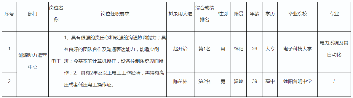 根據(jù)四川長(zhǎng)虹電器股份有限公司發(fā)布的招聘公告及招聘相關(guān)規(guī)定,經(jīng)筆試、面試、考察、體檢等程序,擬錄用趙開治等同志到能源動(dòng)力運(yùn)營(yíng)中心工作,現(xiàn)予以公示,具體情況如下: