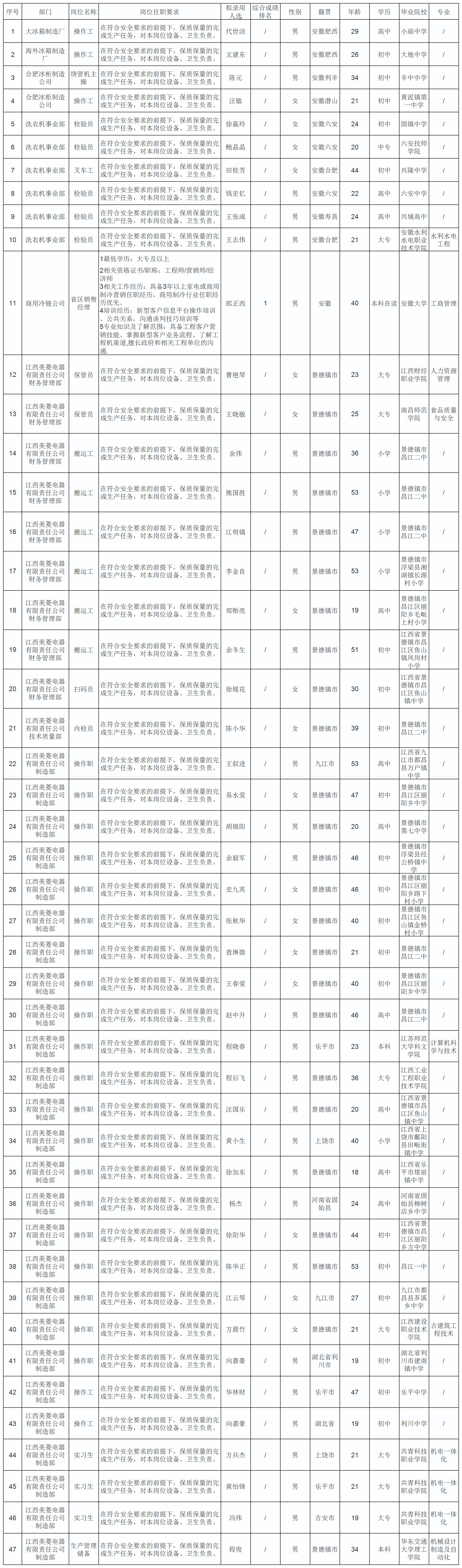 根據(jù)長虹美菱股份有限公司發(fā)布的招聘公告及招聘相關(guān)規(guī)定,經(jīng)面試、體檢等程序,擬錄用代世潔等47名同志到大冰箱制造廠等部門工作,現(xiàn)予以公示,具體情況如下: