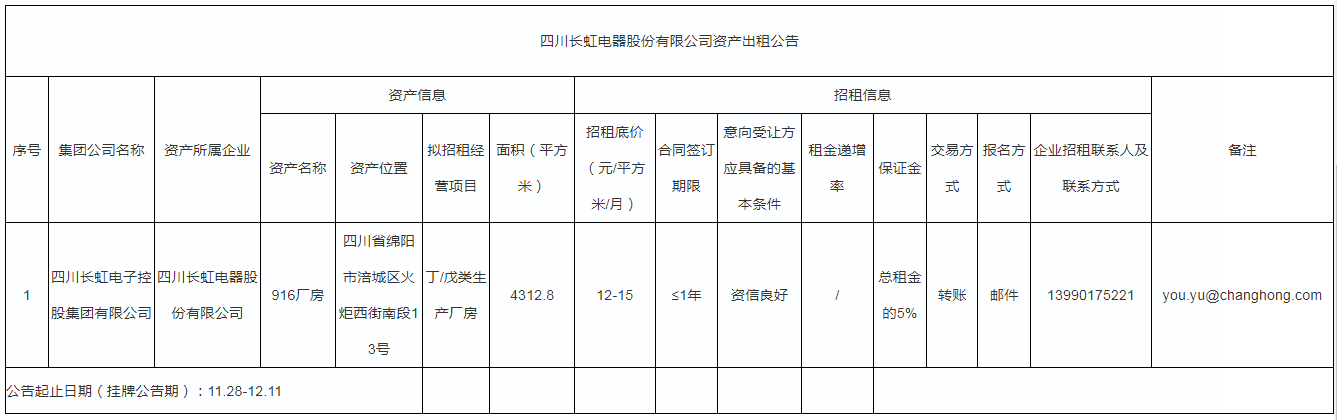 四川長虹電器股份有限公司資產(chǎn)出租公告