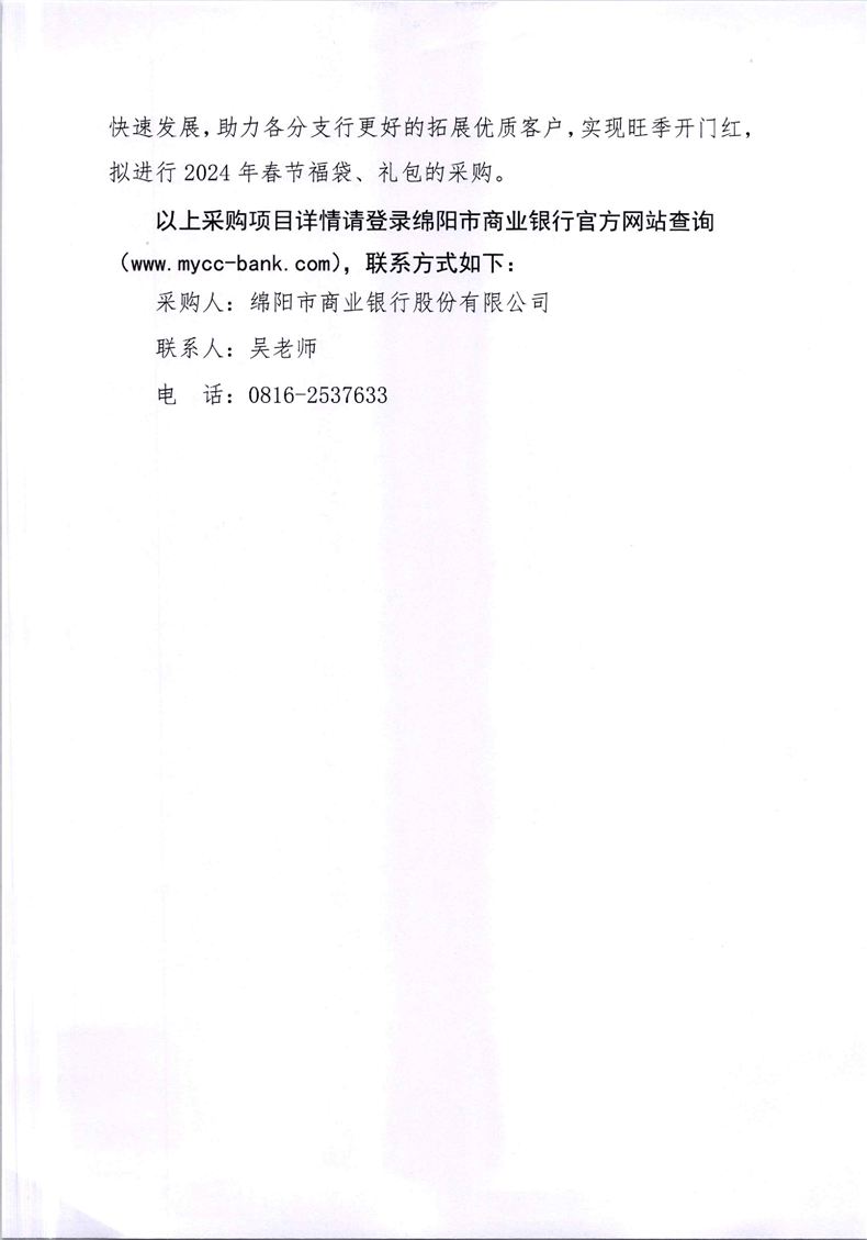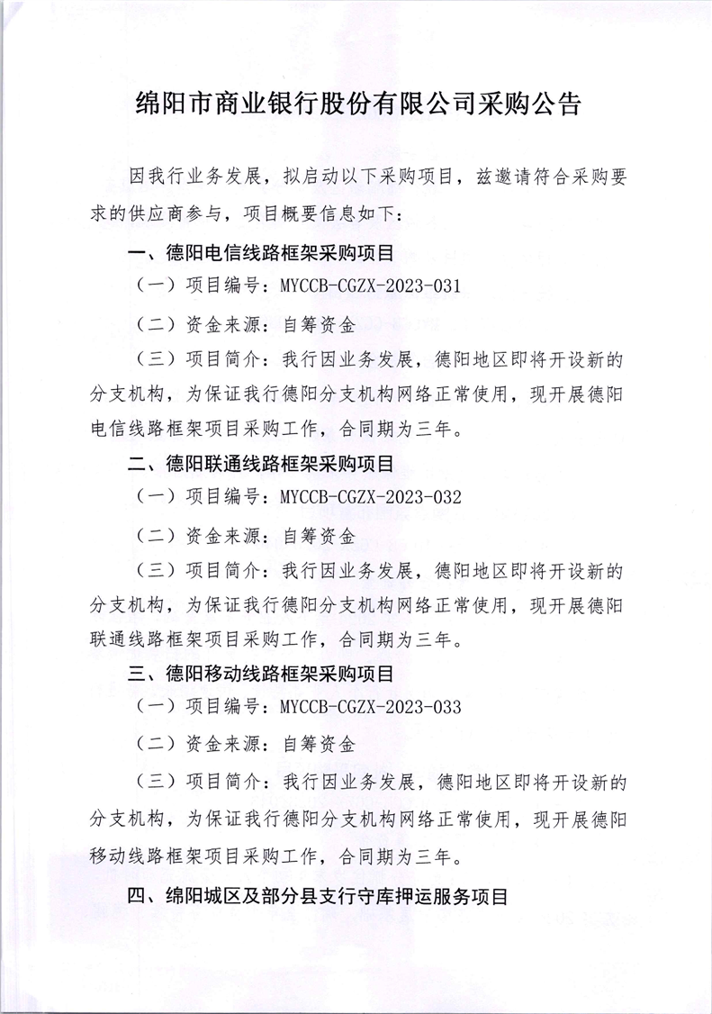 綿陽市商業(yè)銀行股份有限公司采購公告