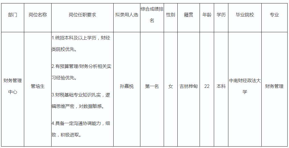 根據(jù)四川波鴻實業(yè)有限公司發(fā)布的招聘公告及招聘相關規(guī)定,經(jīng)面試綜合評估,擬錄用孫嘉悅為財務管理中心管培生,現(xiàn)予以公示,具體情況如下: