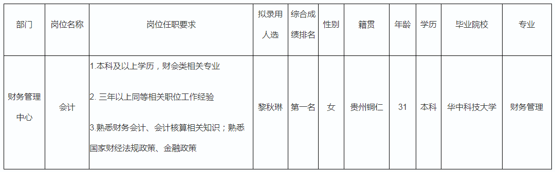 根據(jù)四川波鴻實業(yè)有限公司發(fā)布的招聘公告及招聘相關(guān)規(guī)定,經(jīng)面試綜合評估,擬錄用黎秋琳為會計,現(xiàn)予以公示,具體情況如下: