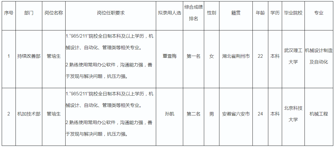 根據(jù)四川波鴻實業(yè)有限公司發(fā)布的招聘公告及招聘相關(guān)規(guī)定,經(jīng)面試綜合評估,擬錄用以下人員為威斯卡特工業(yè)(中國)有限公司管培生,現(xiàn)予以公示,具體情況如下: