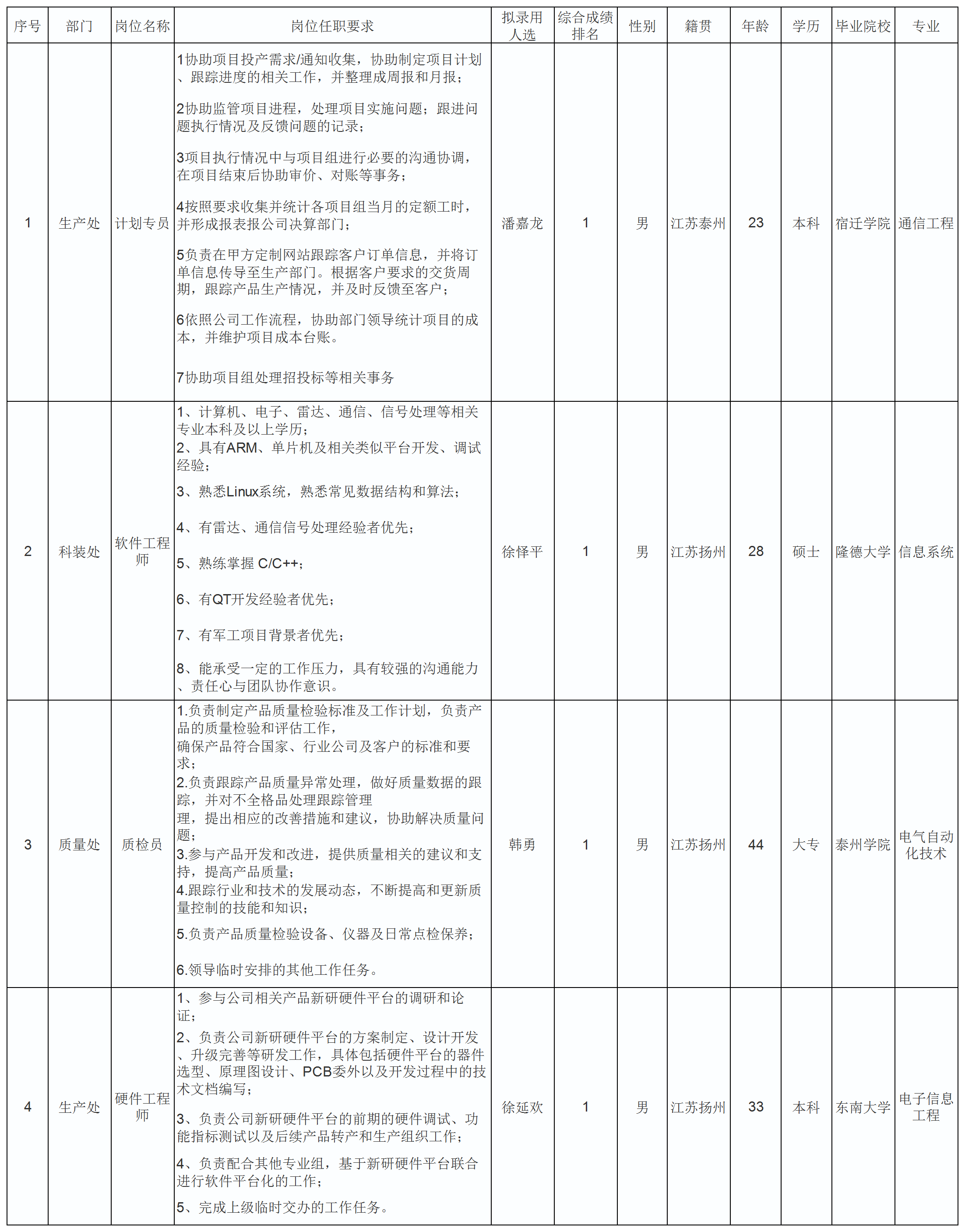 根據(jù)上海志良電子科技有限公司發(fā)布的招聘公告及招聘相關規(guī)定,經(jīng)筆試、面試、考察、體檢等程序,擬錄用潘嘉龍、徐懌平、韓勇、徐延歡同志到上海志良電子科技有限公司工作,現(xiàn)予以公示,具體情況如下: