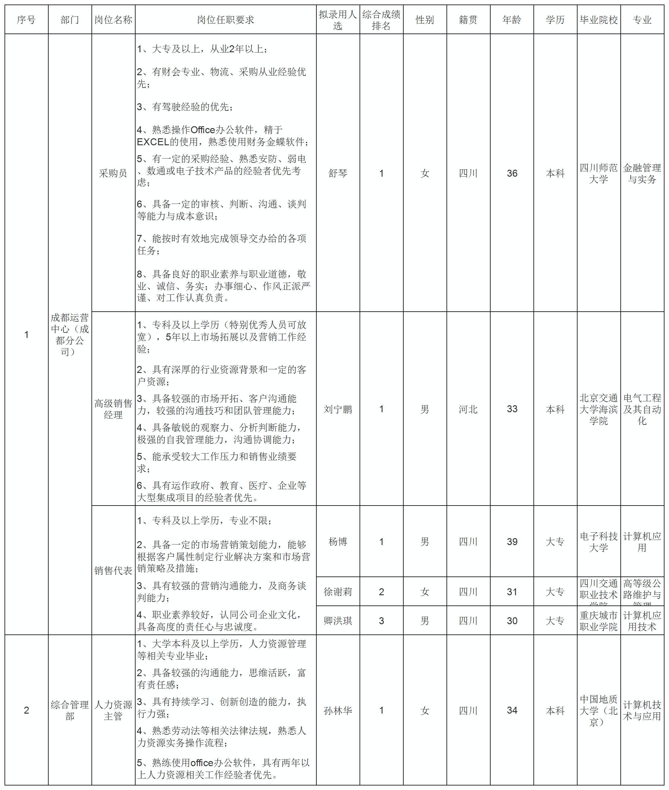 根據(jù)四川科瑞軟件有限責(zé)任公司發(fā)布的招聘公告及招聘相關(guān)規(guī)定,經(jīng)筆試、面試、考察、體檢等程序,擬錄用舒琴等6名同志到四川科瑞軟件有限責(zé)任公司工作,現(xiàn)予以公示,具體情況如下: