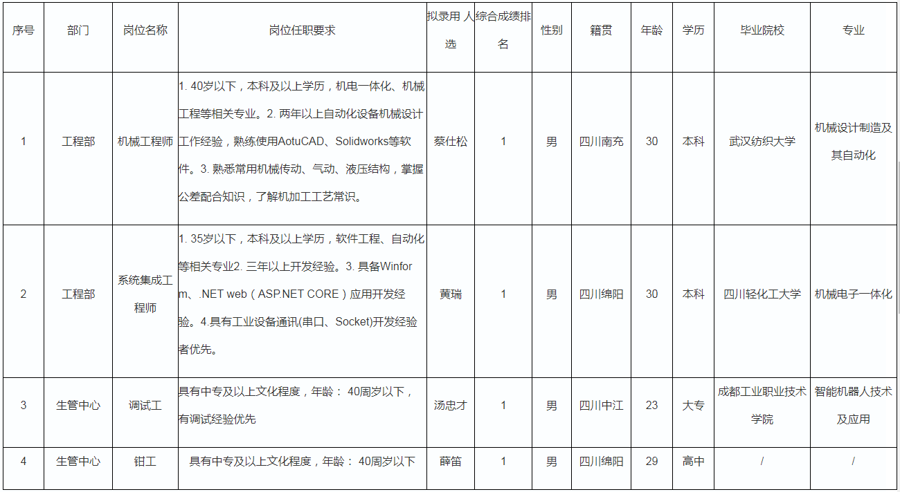 根據(jù)四川長虹智能制造技術(shù)有限公司發(fā)布的招聘公告及招聘相關(guān)規(guī)定,經(jīng)面試、考察、體檢等程序,擬錄用蔡仕松、黃瑞、湯忠才、薛笛同志到四川長虹智能制造技術(shù)有限公司工作,現(xiàn)予以公示,具體情況如下: