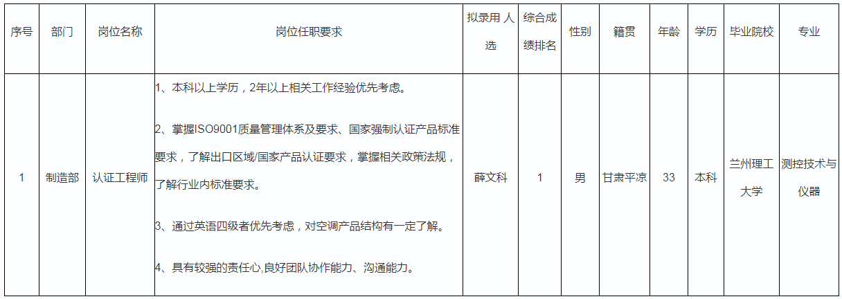 根據(jù)中山長虹電器有限公司發(fā)布的招聘公告及招聘相關規(guī)定,經(jīng)面試、考察、體檢等程序,擬錄用薛文科同志到認證工程師崗位工作,現(xiàn)予以公示,具體情況如下: