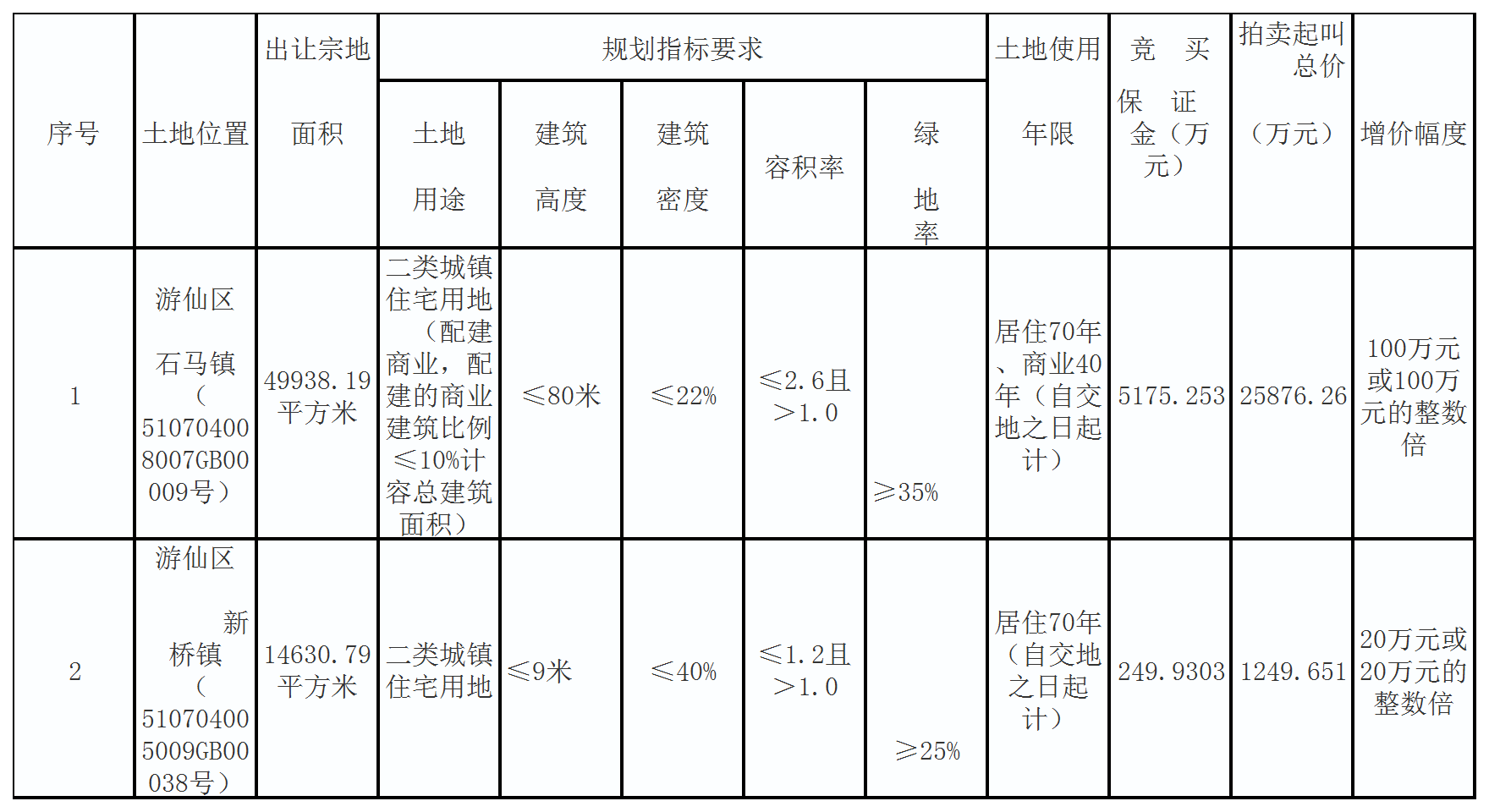 上述2宗地均以現(xiàn)狀出讓,1號宗地土地利用要求詳見《地塊規(guī)劃條件》(綿自然資規(guī)設〔2023〕265號),2號宗地土地利用要求詳見《地塊規(guī)劃條件》(綿自然資規(guī)設〔2023〕249號)及《規(guī)劃審查意見》(綿自然資規(guī)審〔2023〕752號)。
