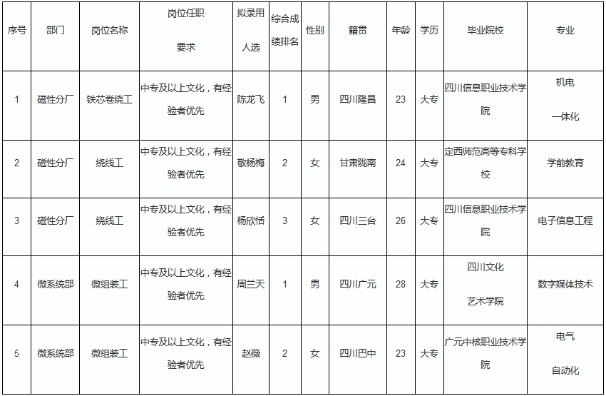 根據(jù)零八一電子集團(tuán)四川力源電子有限公司發(fā)布的招聘公告及招聘相關(guān)規(guī)定,經(jīng)筆試、面試、考察、體檢等程序,擬錄用周蘭天等同志到力源公司工作,現(xiàn)予以公示,具體情況如下: