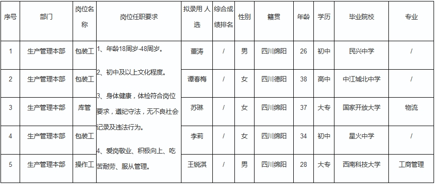 根據(jù)四川長(zhǎng)虹新能源科技股份有限公司發(fā)布的招聘公告及招聘相關(guān)規(guī)定,經(jīng)面試、體檢等程序,擬錄用董濤等5名同志到四川長(zhǎng)虹新能源科技股份有限公司工作,現(xiàn)予以公示,具體情況如下: